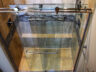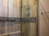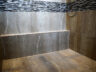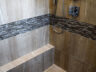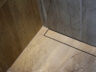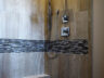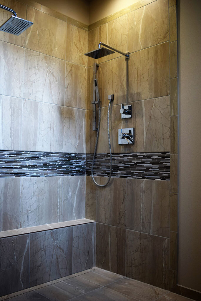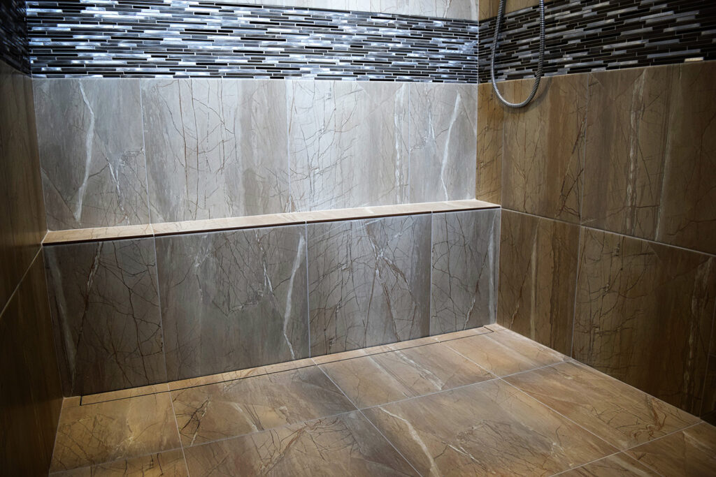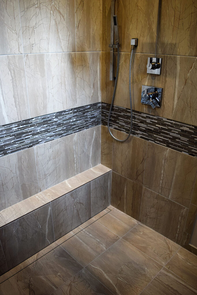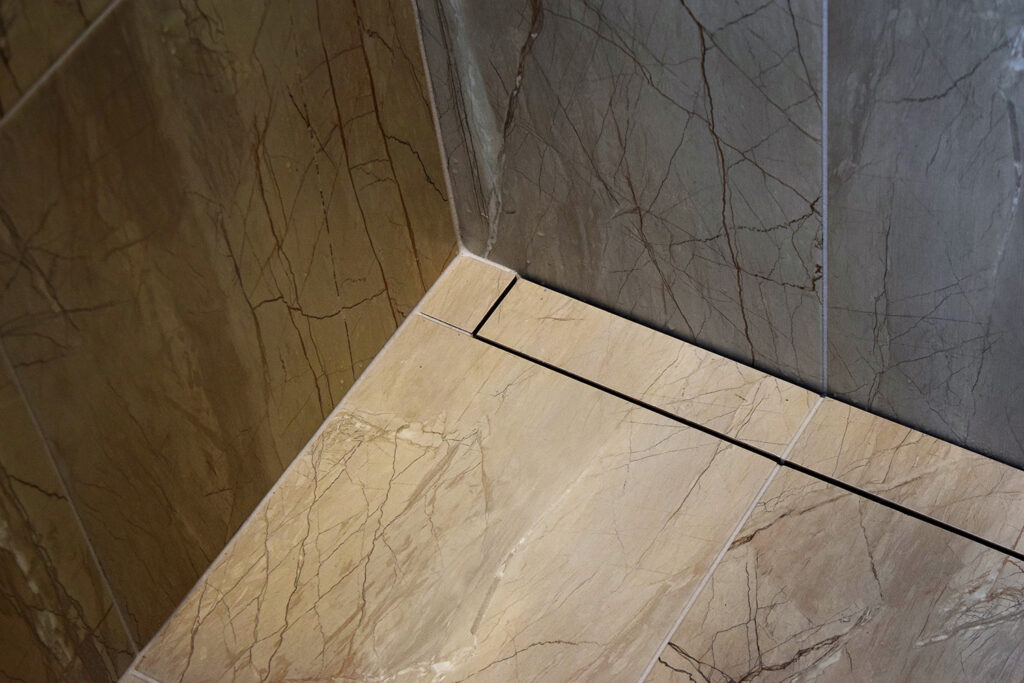We used large format 18″ x 18″ porcelain tile on the walls and floor – including all the way through the shower floor – which was possible with the use of linear strip drain (no need for compound slope, as is required with a standard type drain).