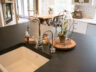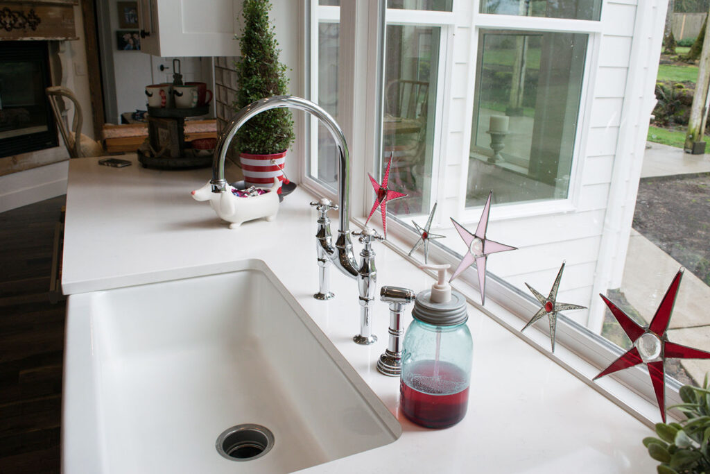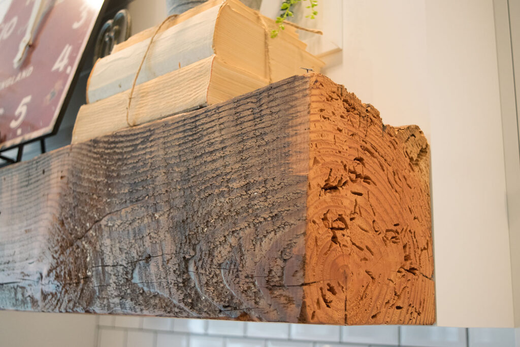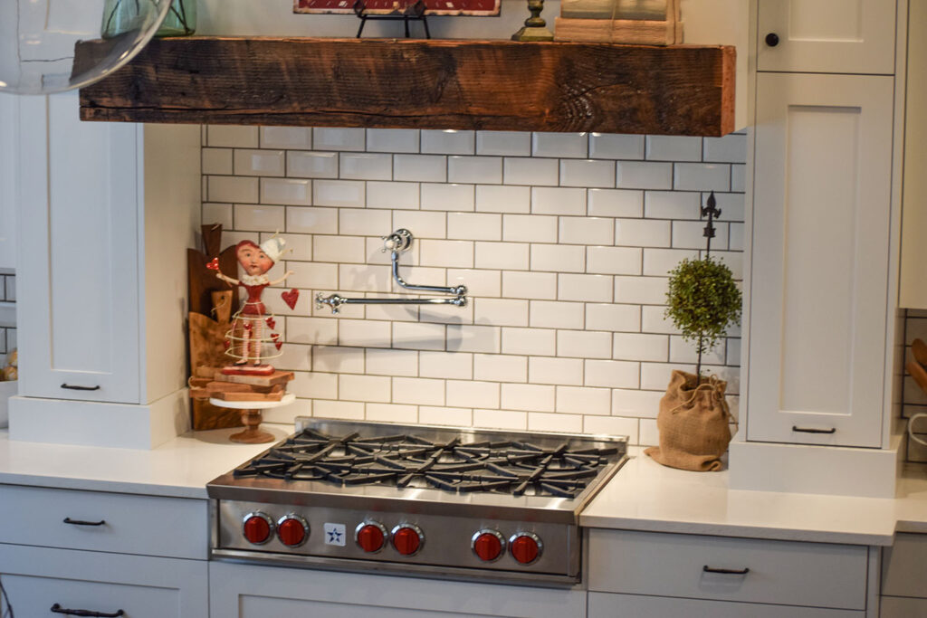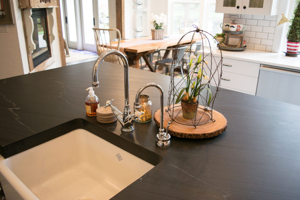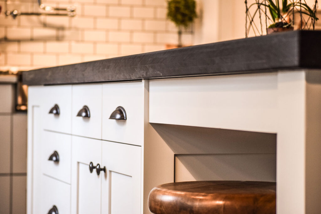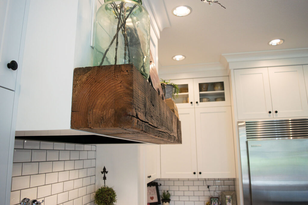 The beam over cook top was reclaimed from an old barn. The perimeter counter tops are white quartz, while the island is a honed Schist (similar to Quartzite), a natural stone.